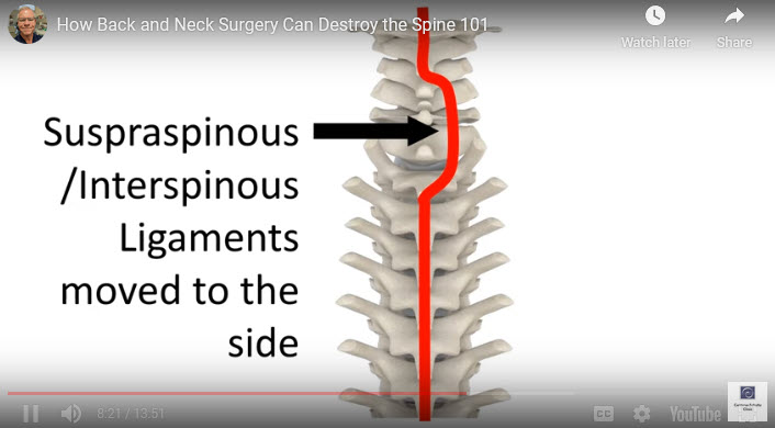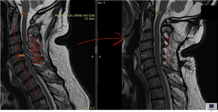 As a result, the spinous ligament “suspension bridge” of the neck was now damaged, and the stabilizing spinous muscles were also damaged. In addition, the patient’s neck curve lost its natural curve and got noticeably straighter because of the loss of ligament stabilization of the neck.