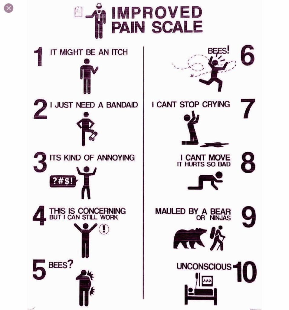 The best rule of thumb is to ASK them. “On a scale of 1 to 10, where 1 is ‘I don’t feel it at all’ and ’10’ is ‘take me to the emergency room’, how does this feel right here?” After explaining that, ask them what’s the first number that pops into their head. That’s usually the best answer. Some people have to analyze everything, and they get lost in their heads.