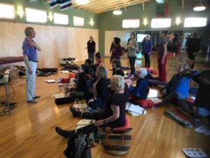 I did a condensed Muscle Balancing and Joint Stabilization class last weekend at the Arkansas Yoga and Therapy Center in Fayetteville. It was such a fun group of yoga teachers and trainees. A wonderful, enthusiastic, and sweet energy. I enjoyed myself thoroughly. The participants could easily see how the Quick Self Fixes would help them and their yoga students. The program was part of the AYC Advanced Yoga Teacher Training. The photo credits go to Andrea Place Fournet, who is sitting holding Rocky the dog while guiding David Fournet at the camera.
